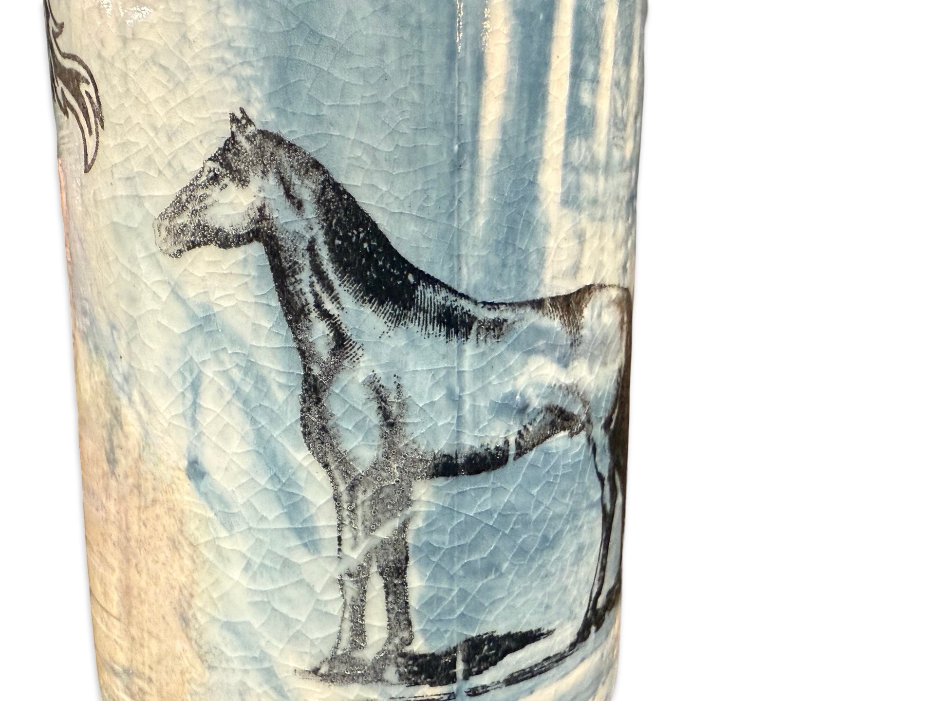 Porcelain with Black Images of horses and roper. Textured with Clear and Blue crackle Glaze over all.